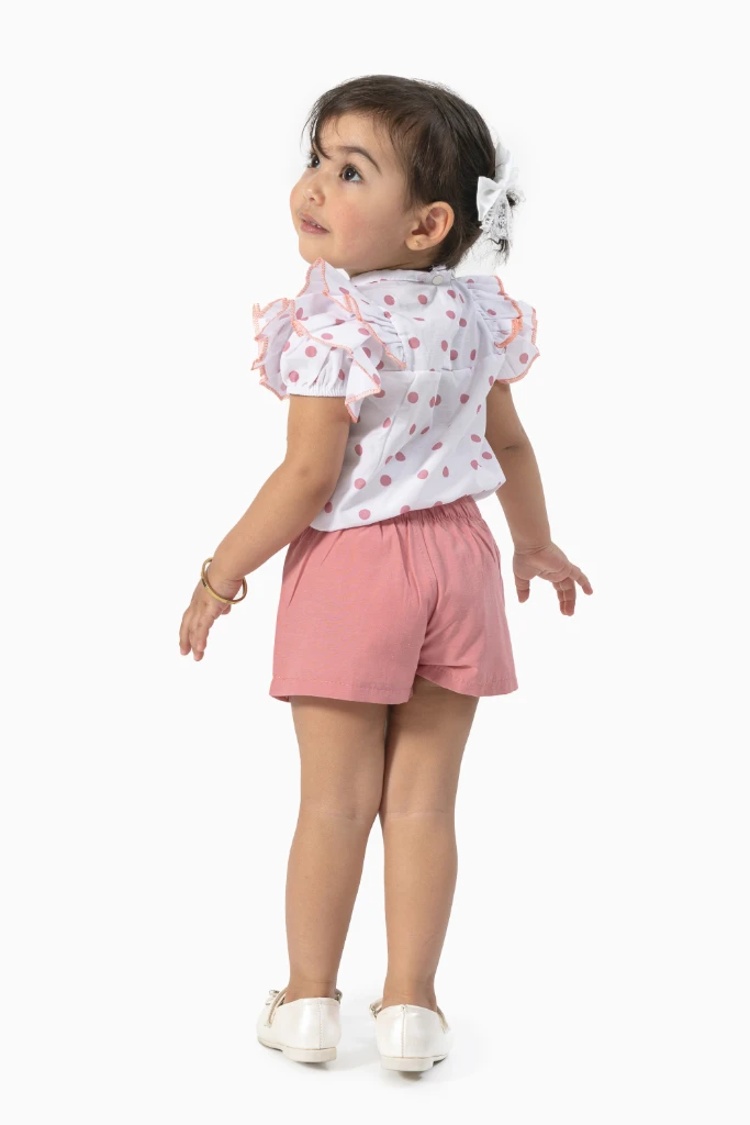 - Bebeğinizin cildine nazik dokunuşuyla pamuklu kumaştan üretilmiştir, gün boyu rahatlık sağlar.; - Puantiyeli deseniyle şık ve eğlenceli bir görünüm sunar, minik prenseslerin tarzını yansıtır.; - Bol kalıbı sayesinde hareket özgürlüğünü kısıtlamaz, rahat bir kullanım imkanı tanır.; - Standart boyu ile farklı vücut tiplerine uyum sağlayarak ideal oturuş sunar.; - Büzgülü/fırfırlı kol tasarımı ile hem modern hem de sevimli bir stil oluşturur.; - Düz paça kesimiyle pratik giyim avantajları sunarken, şortun alt kısmındaki detaylarla göz alıcı bir görünüm kazandırır.; - Kısa kol boyu yaz ayları için idealdir; serin tutar ve güneşin tadını çıkarmayı kolaylaştırır.; - 2'li paket içeriğiyle hem bluz hem de şortu tek seferde satın alma fırsatınız olur; böylece kombinleriniz tamamlanmış olur.